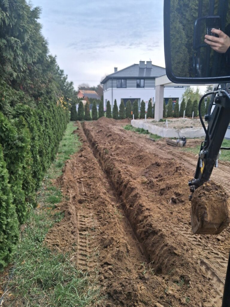 - Wykopy pod przyłącza wodno-kanalizacyjne, elektryczne, telefoniczne i gazowe.
